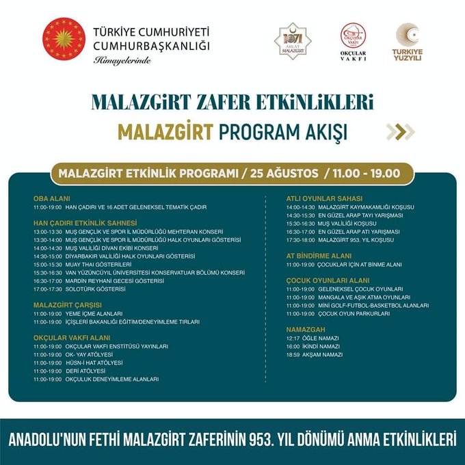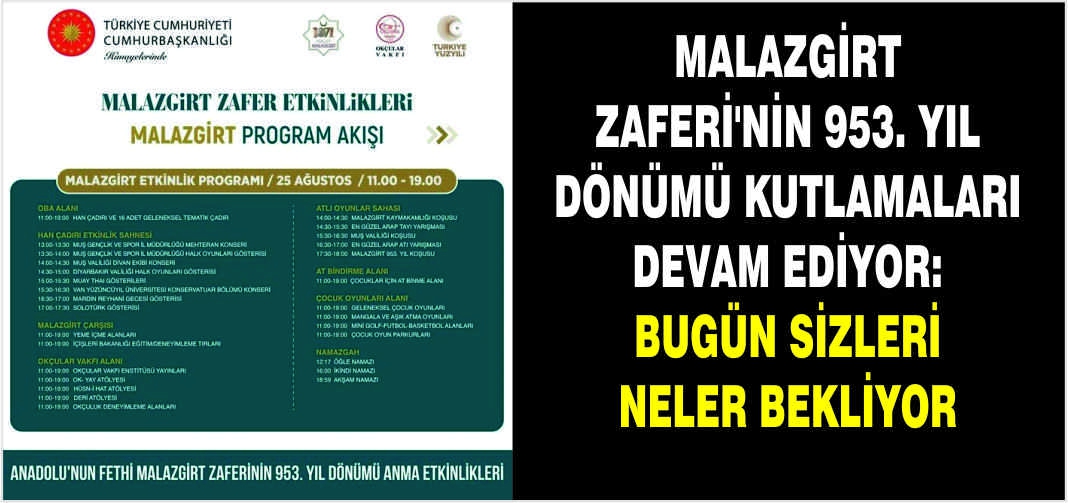 Malazgirt Zaferi'nin 953. yıl dönümü etkinlikleri, 26 Ağustos'ta Cumhurbaşkanı Recep Tayyip Erdoğan'ın katılımıyla gerçekleştirilecek büyük final ile sona erecek. Cumhurbaşkanı Erdoğan'ın burada önemli mesajlar vermesi bekleniyor.
