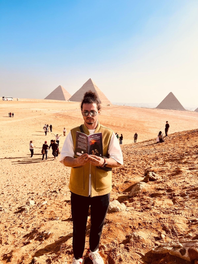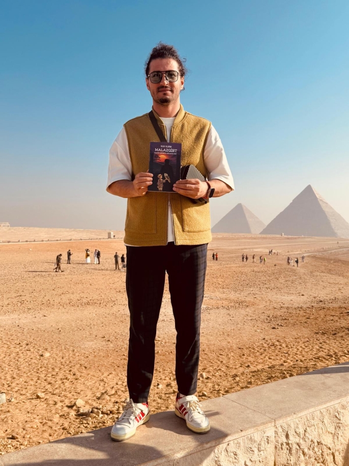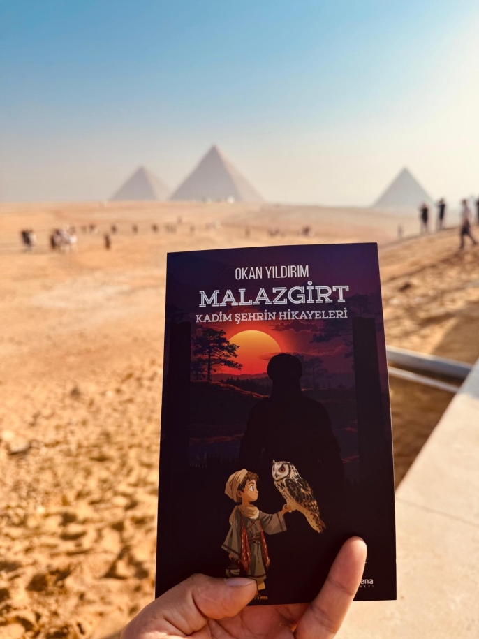 ALPARSLAN DİYARI- Ümit Yıldırım, Malazgirtli eğitimci ve yazar Okan Yıldırım tarafından kaleme alınan “Malazgirt: Kadim Şehrin Hikâyeleri” adlı kitabı, kadim medeniyetlerin beşiği olan Mısır’da, piramitlerin önünde okuyarak tarihle buluşturdu.