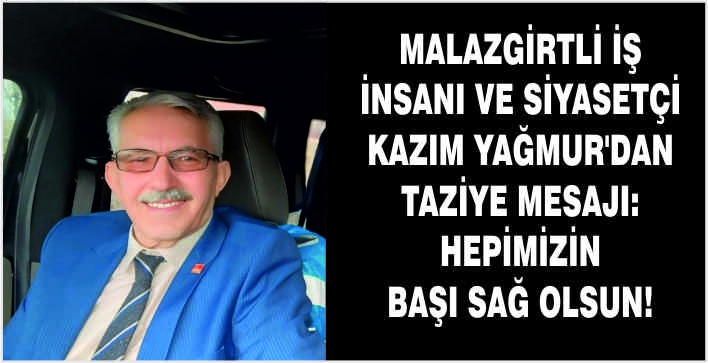 ALPARSLAN DİYARI- Siyasetçi ve İş İnsanı Kazım Yağmur, taziye mesajında, "Cumhuriyet Halk Partimizin Malazgirt İlçe Başkanlığını yıllarca yürütmüş, Malazgirt CHP Belediye Başkan adayımız, değerli büyüğümüz Mevlüt Güvenir’in vefatını üzüntüyle öğrendim. Kendisi, ilçe yönetimimizdeki önemli rolü ve özverili çalışmalarıyla hepimizin gönlünde özel bir yer edinmişti. Bu zor günlerde ailesinin ve tüm Malazgirt halkının başı sağ olsun. Mekanı cennet olsun." ifadelerini kullandı.
