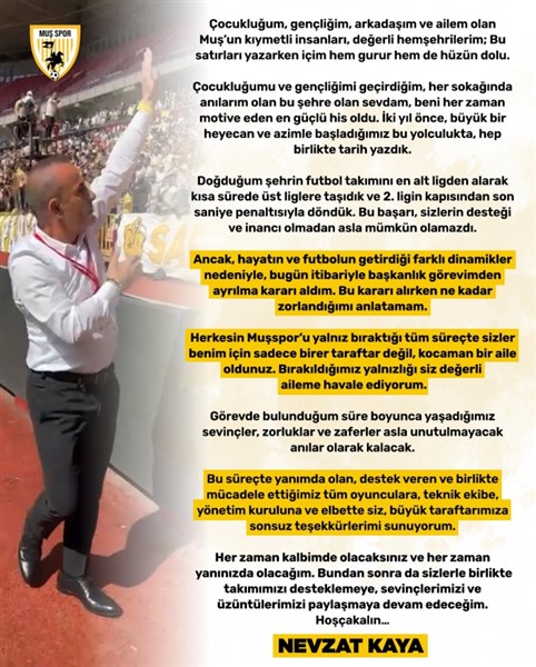 Nevzat Kaya, her zaman kalbinde olacaklarını ve her zaman yanlarında olacağını belirterek, bundan sonra da Muşspor’u desteklemeye devam edeceğini söyledi. Kaya’nın bu duygusal veda mektubu, Muşspor camiasında derin bir etki yarattı.
