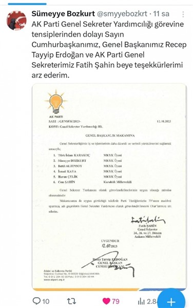 MKYK Üyesi Sümeyye Bozkurt sosyal medya hesaplarında yaptığı paylaşımda AK Parti Genel Sekreter Yardımcılığı görevine getirldiğini duyurdu.