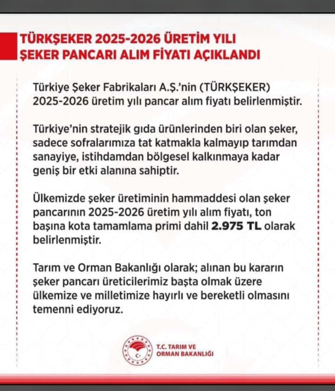 ALPARSLAN DİYARI – Şeker pancarının tarım, sanayi, istihdam ve bölgesel kalkınmada stratejik bir ürün olduğunu vurgulayan Tarım ve Orman Bakanlığı, alınan kararın üreticiler başta olmak üzere tüm ülkeye hayırlı olmasını diledi.
