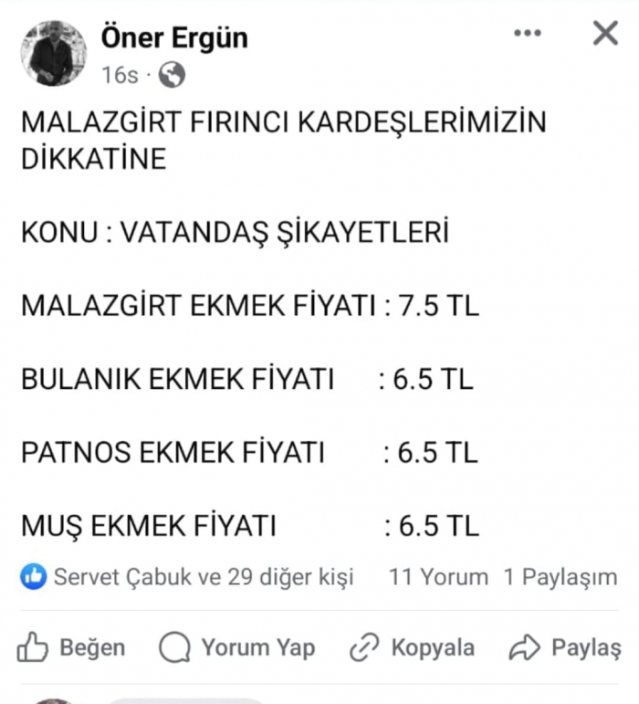 Malazgirtli vatandaşlardan Öner Ergün, sosyal medya hesaplarında yaptığı paylaşımda ekmek fiyatlarının yüksek olmasından dolayı duyduğu rahatsızlığı dile getirdi. Ergün'ün paylaşımı kısa sürede büyük ilgi gördü ve birçok kişi tarafından paylaşıldı.