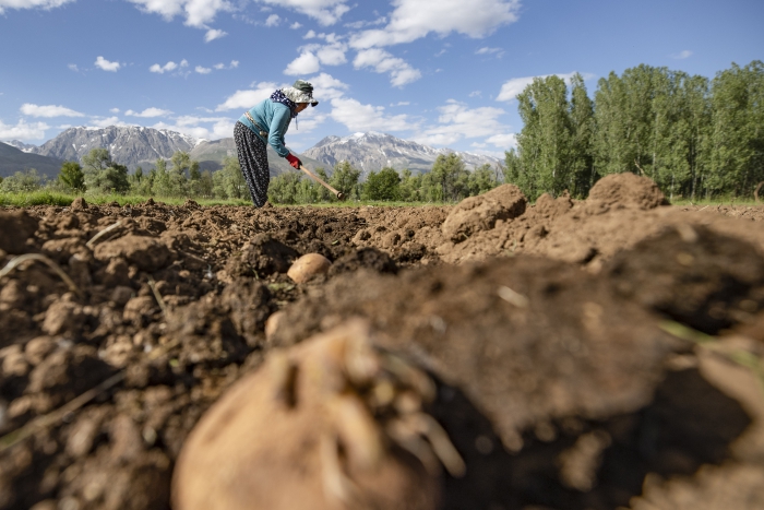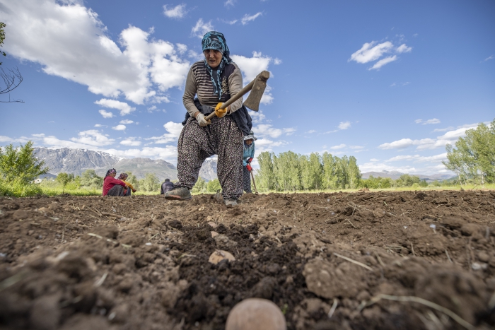 Toprağı hayvan gübresiyle harmanlayan köylüler, daha sonra patatesleri kazma, kürek, el arabası, tırmık ve çapa kullanarak geleneksel yöntemlerle toprağa gömüyor.
