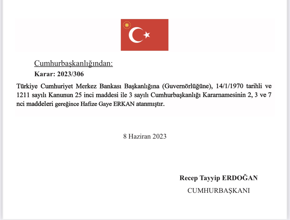 Resmi Gazete'de yayımlanan karara göre Merkez Bankası Başkanlığı'na Hafize Gaye Erkan atandı.