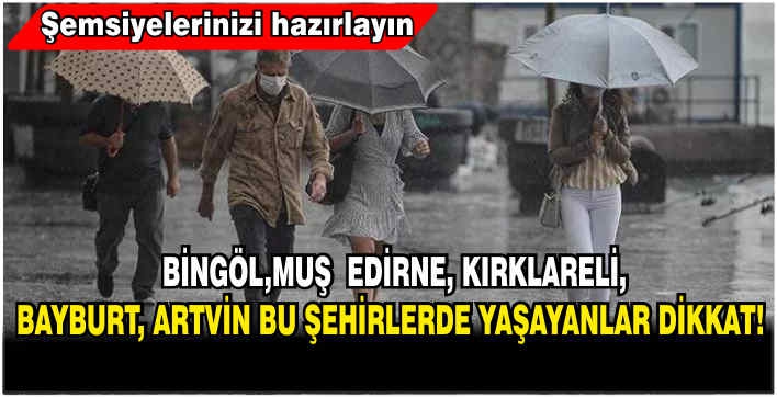 ALPARSLAN DİYARI-Meteoroloji Genel Müdürlüğü tarafından yayımlanan güncel hava durumu tahmin raporuna göre; Yurdumuz genelinin parçalı yer yer çok bulutlu, Doğu Anadolu'nun kuzeyi ile Edirne, Kırklareli, Bayburt, Artvin, Muş ve Bingöl çevreleri ile Rize'nin iç kesimlerinin yerel sağanak ve gök gürültülü sağanak yağışlı geçeceği tahmin ediliyor.