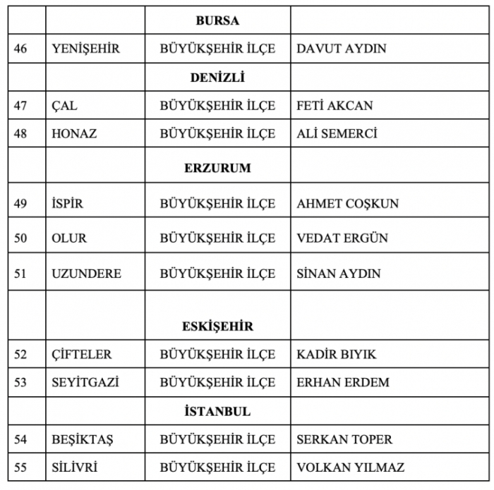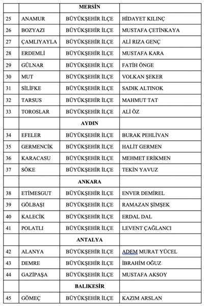 Açıklanan 12 il belediye başkan adayları arasında Amasya'da Bayram Çelik, Çankırı'da İsmail Hakkı Esen, Erzincan'da Bekir Aksun ve Osmaniye'de İbrahim Çenet bulunuyor.