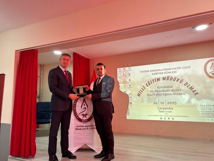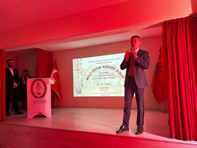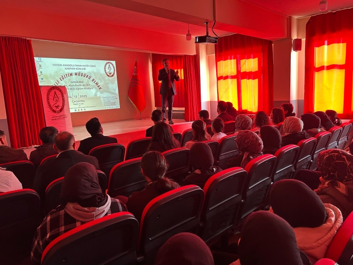 ALPARSLAN DİYARI- Programa konuşmacı olarak katılan Milli Eğitim Müdürü Abdulkadir Altay, “Milli Eğitim Müdürü Olmak” başlıklı konferansında öğrencilerle bilgi, tecrübe ve hayat yolculuğunu paylaştı.
