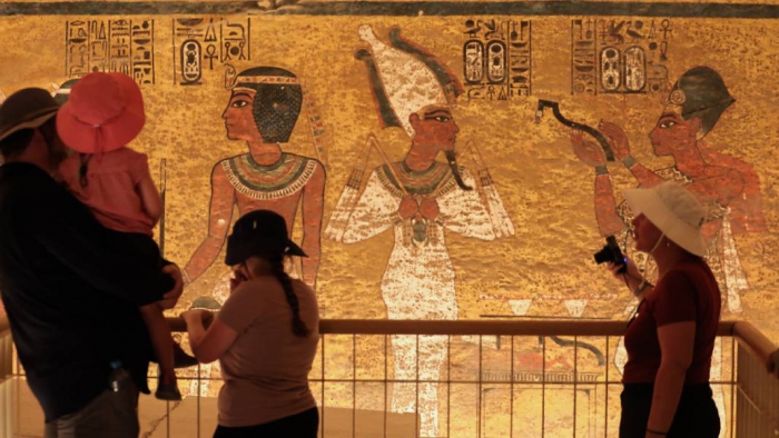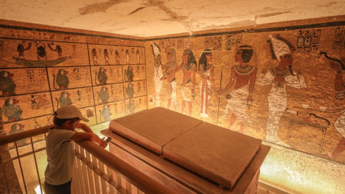 Mezarda, Tutankamon'un mumyası, maskesiz bir şekilde sergileniyor.