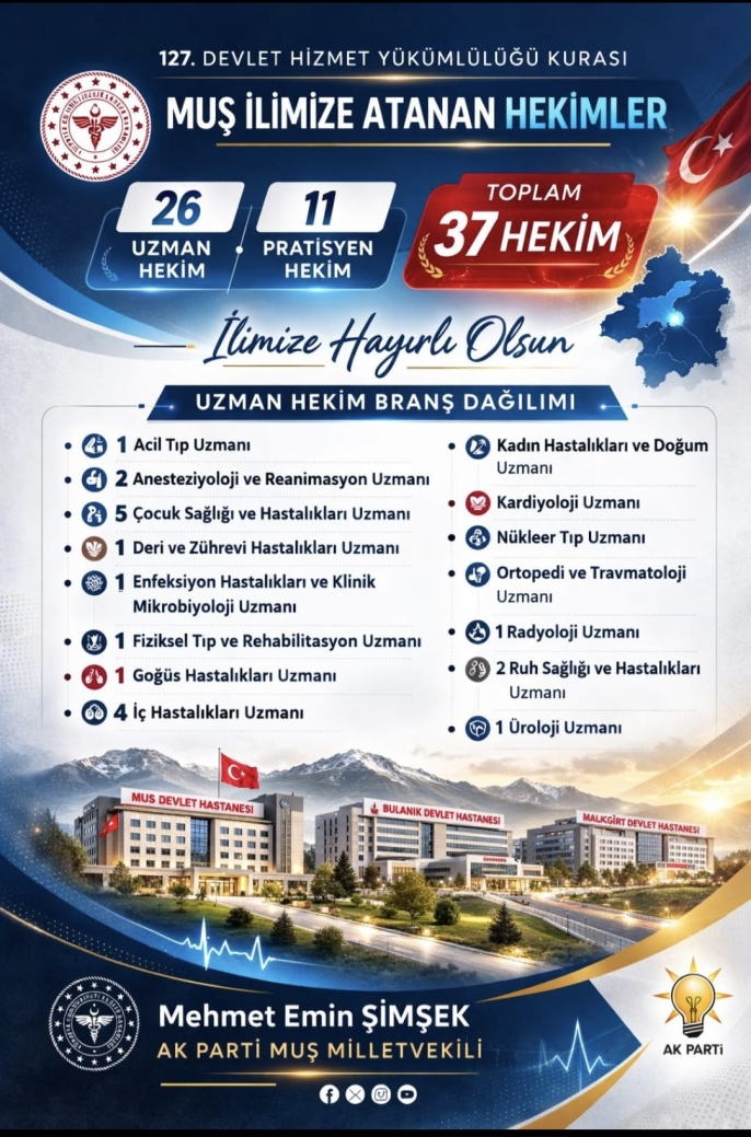 “Sağlık alanında Muş’umuza yapılan her yatırım, vatandaşlarımızın yaşam kalitesine doğrudan katkı sunmaktadır. 127. DHY kurası kapsamında ilimize atanan 26 uzman ve 11 pratisyen hekim ile birlikte sağlık hizmetlerimizin niteliği daha da artacaktır. Başta Sayın Cumhurbaşkanımız olmak üzere Sağlık Bakanlığımıza teşekkür ediyor, ilimize atanan tüm hekimlerimize görevlerinde başarılar diliyorum. Muş’umuza hayırlı olsun.”