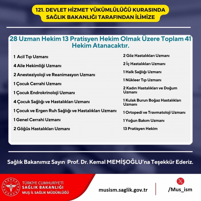 Muş İl Sağlık Müdürlüğü, bu atamaların ildeki sağlık hizmetlerine önemli katkı sağlayacağını belirtirken, Sağlık Bakanı Prof. Dr. Kemal Memişoğlu’na teşekkür etti.