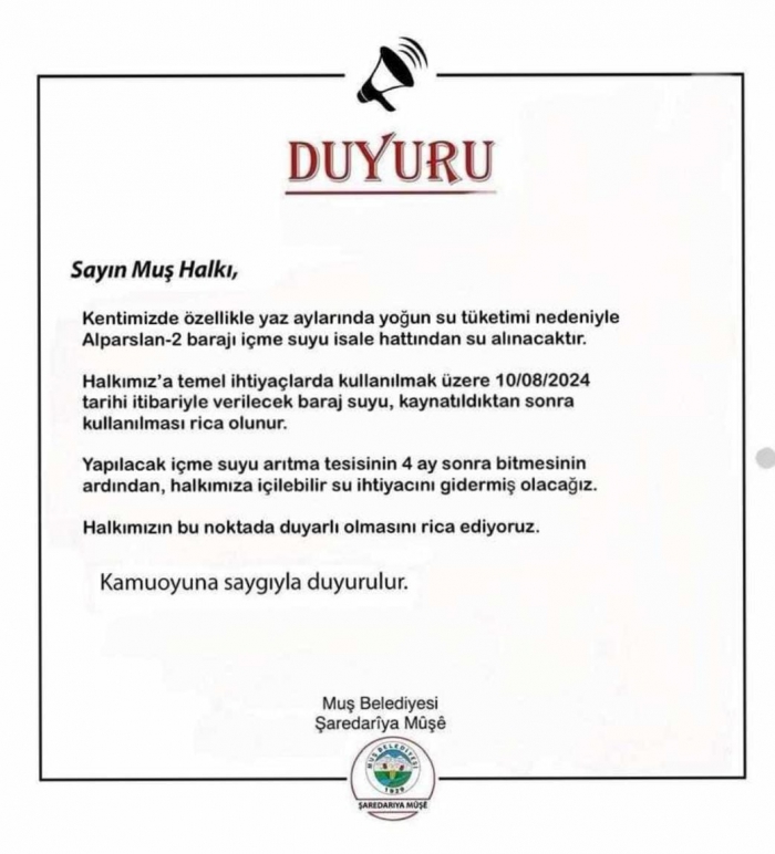 Muş Belediyesi Eş Başkanı Sırrı Söylemez ve Tuba Sayılğan yaptıkları açıklamada, “Sayın Muş Halkı, Kentimizde özellikle yaz aylarında yoğun su tüketimi nedeniyle Alparslan-2 barajı içme suyu isale hattından su alınacaktır. Halkımıza temel ihtiyaçlarda kullanılmak üzere 10/08/2024 tarihi itibariyle verilecek baraj suyu, kaynatıldıktan sonra kullanılması rica olunur.