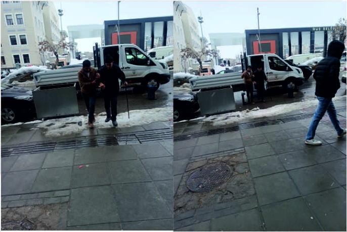 Kaygan zemin ve dondurucu soğuğa rağmen görevini sürdüren Deniz Eçin, yürümekte güçlük çeken yaşlı vatandaşı fark eder etmez harekete geçti. Hiç tereddüt etmeden yaşlı vatandaşın koluna giren Eçin, güvenli bir şekilde ilerlemesine yardımcı oldu ve gideceği noktaya ulaşmasını sağladı. O anlar, çevrede bulunan vatandaşlar tarafından da takdirle karşılandı.