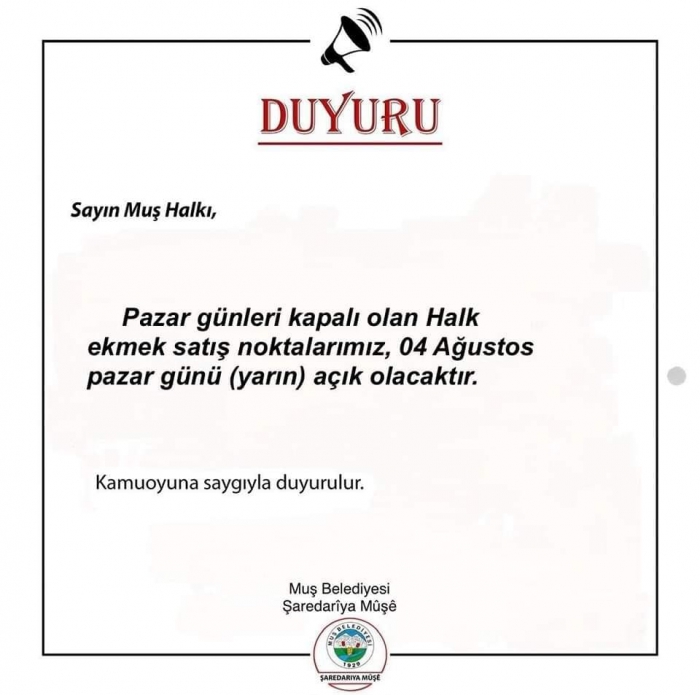 ALPARSLAN DİYARI- Muş Belediyesi'nden yapılan duyuruya göre, normalde pazar günleri kapalı olan Halk Ekmek satış noktaları, 4 Ağustos Pazar günü (bugün) hizmet verecek.