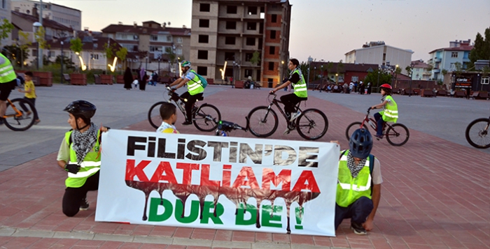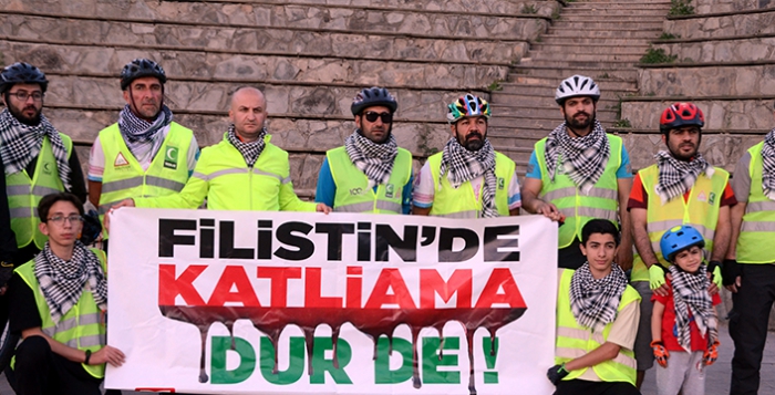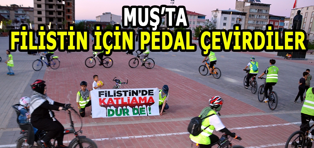 ALPARSLAN DİYARI-Muş Lale Vadisi Parkı'nda bir araya gelen dernek üyeleri, 3 kilometre bedal çevirerek Kent Meydanı'na geldi. Burada açıklama yapan dernek başkanı Mehmet Sezgin, gazetecilere, aylardır süren İsrail zulmünü kınamak için bir araya geldiklerini söyledi.