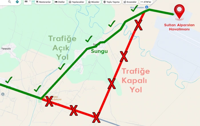 Karayolları Bölge Müdürlüğü’nün yürüttüğü çalışmalar kapsamında, havalimanı ulaşımı geçici bir süreyle Sungu Beldesi’nden geçen eski yol üzerinden sağlanacak.