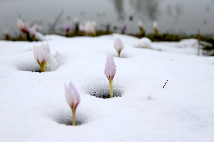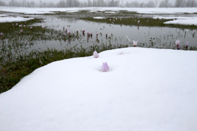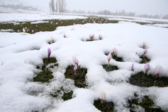 Dün etkisini gösteren yağışın ardından çiğdemler kar altında kaldı.