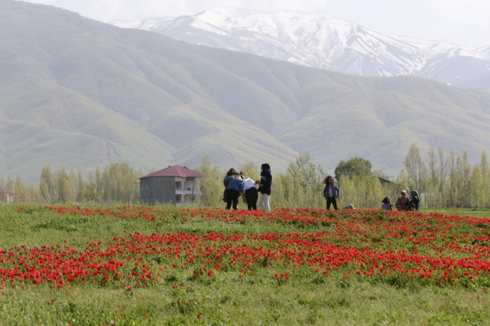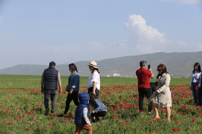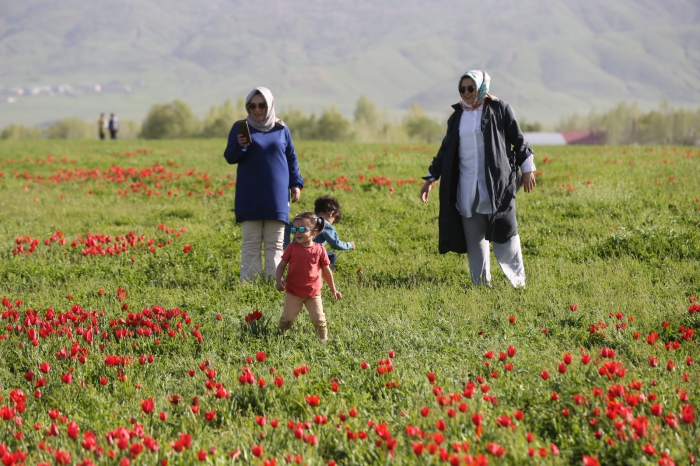Muş Ovası, ilkbaharda açan lalelerle kırmızıya büründü. 'Muş 1071' ismiyle tescillenen laleler, canlılığını koruyabildiği 15 günlük sürede ziyaretçi akınına uğruyor.