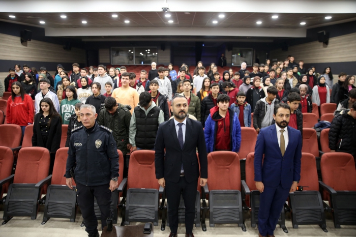 Emniyetin konferans salonunda düzenlenen etkinlikte, öğrencilere patlamış mısır ve içecek ikram ederek sinema ortamı oluşturuldu.
