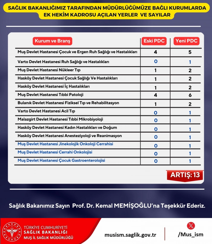 Bu gelişmelerle birlikte Muş’ta sağlık hizmetlerinin daha da güçlenmesi ve vatandaşların sağlık ihtiyaçlarına daha hızlı çözüm sunulması hedefleniyor. Muş’a kazandırılan yeni uzman doktorlar sayesinde sağlık hizmetleri daha kapsamlı ve erişilebilir hale gelecek.