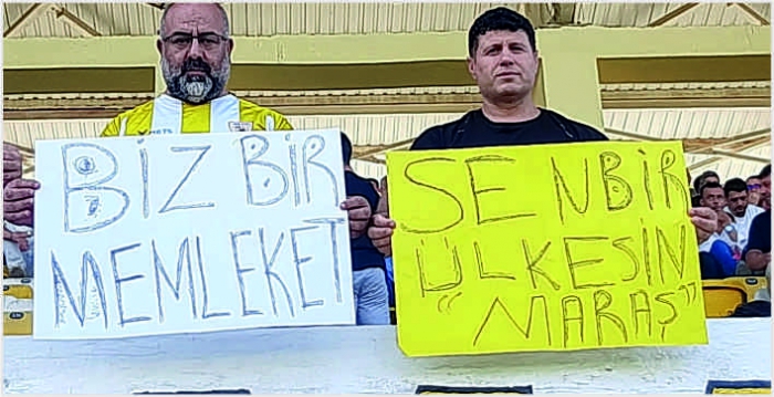 ALPARSLAN DİYARI- Maraş depreminde hayatını kaybedenleri ve depremzedeleri unutmayan taraftarlar, tribünlerde açtıkları pankartlarla duygusal bir mesaj verdi. "Biz Bir Memleketiz" ve "Sen Bir Ülkesin Maraş" yazılı pankartlar, sahada olduğu kadar tribünlerde de büyük bir yankı uyandırdı.