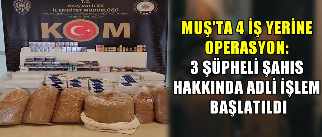 Muş Emniyet Müdürlüğü’nden yapılan yazılı açıklamada şu ifadelere yer verildi: “Kaçakçılık ve Organize Suçlarla Mücadele Şube Müdürlüğümüzce 21.12.2023 günü düzenlenen eşzamanlı operasyon kapsamında 4 iş yerinde yapılan aramada, 9000 adet boş Makaron, 6200 adet dondurulmuş Makaron, 1440 adet sigara sarma kâğıdı, 106 paket gümrük kaçağı sigara, 45 kg kıyılmış tütün, 26 paket bandrolsüz, 15 adet puro, 13 adet elektronik sigara likiti, 12 adet Vozol marka elektronik sigara ele geçirilmiştir.