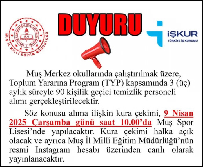 ALPARSLAN DİYARI- Söz konusu personel alımı için kura çekimi, 9 Nisan 2025 Çarşamba günü saat 10.00’da Muş Spor Lisesi’nde gerçekleştirilecek. Kura çekiminin halka açık yapılacağı bildirildi.