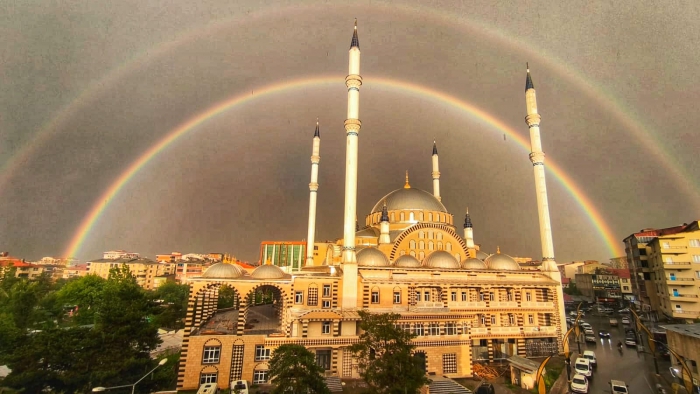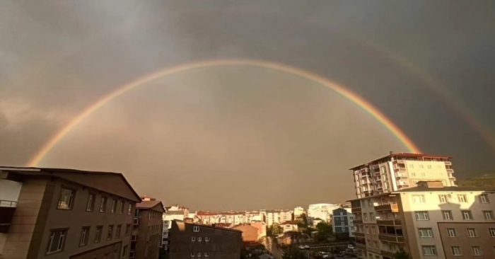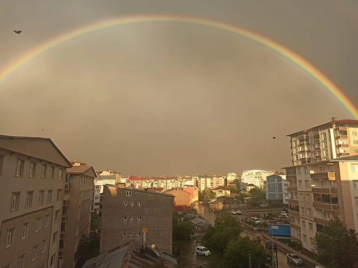 ALPARSLAN DİYARI- Günlerdir durmak bilmeyen yağışlar bu kez mutluluk getirdi. Muş'un çeşitli bölgelerinden şahitler, olağanüstü bir doğa olayına tanıklık etti. Yağmur sonrası güneşin çıkmasıyla birlikte, Muş semalarında muhteşem bir gökkuşağı belirdi. Doğanın renk paletini sergilediği bu görsel şölende, yedi farklı renk birbirine karışarak izleyenlere görsel bir ziyafet sunuyor.