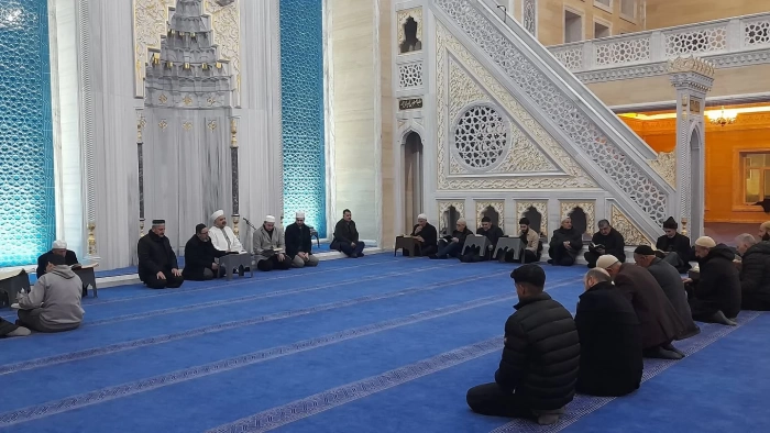 ALPARSLAN DİYARI- Öğle ve ikindi namazlarından sonra hafızlar tarafından tamamen ezbere okunan mukabeleye bölge halkı büyük ilgi gösteriyor. Çevredeki esnafların da katıldığı bu manevi etkinliğe, Muş İl Müftüsü İbrahim Halil Demir de ezbere Kur’an okuyarak eşlik etti.