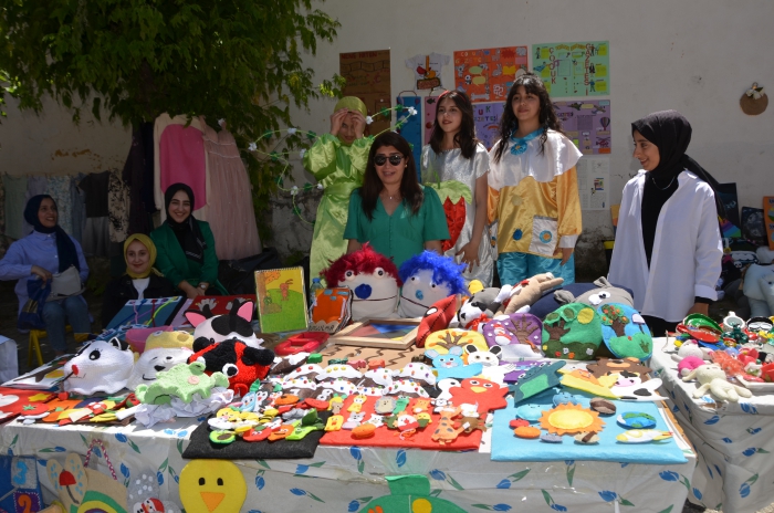 Okul bahçesinde açılan sergide, atık malzemelerden yapılan ürünler sergilendi.