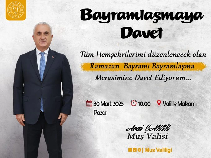 ALPARSLAN DİYARI- Muş Valisi Avni Çakır, tüm hemşehrilerini 30 Mart 2025 Pazar günü saat 10.00’da Valilik Makamı’nda gerçekleştirilecek bayramlaşma programına davet etti.