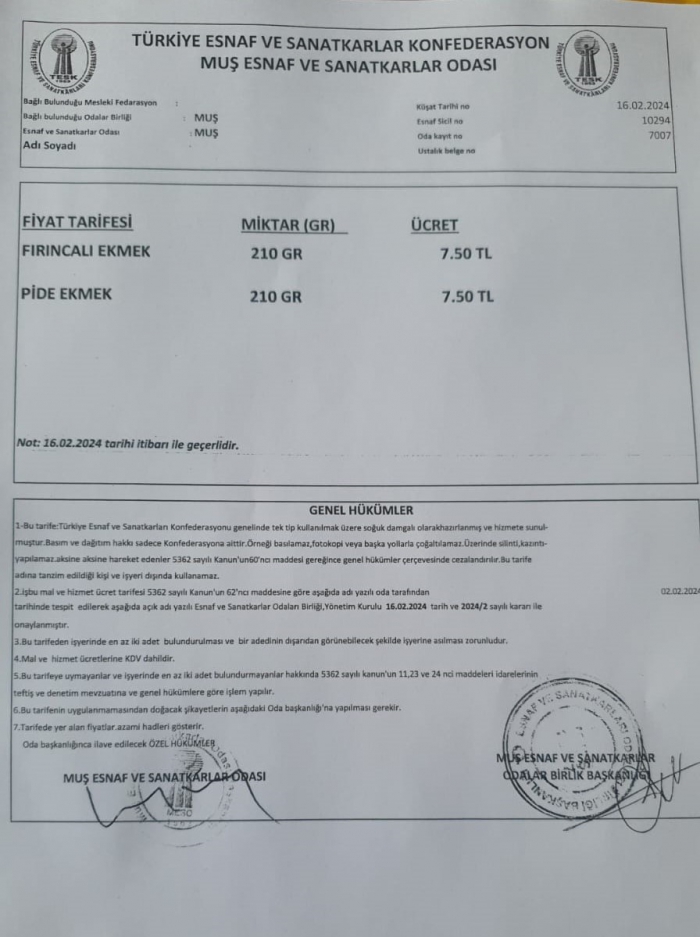 ALPARSLAN DİYARI- Türkiye genelinde ekmek fiyatlarıyla ilgili zam haberleri gelmeye devam ederken Muş’ta da ekmeğe zam geldi. Daha önce 220 gram olan ekmek 210 grama düşürülerek ekmeğin fiyatı 1 lira zamlanarak 7,5 TL olarak belirlendi.