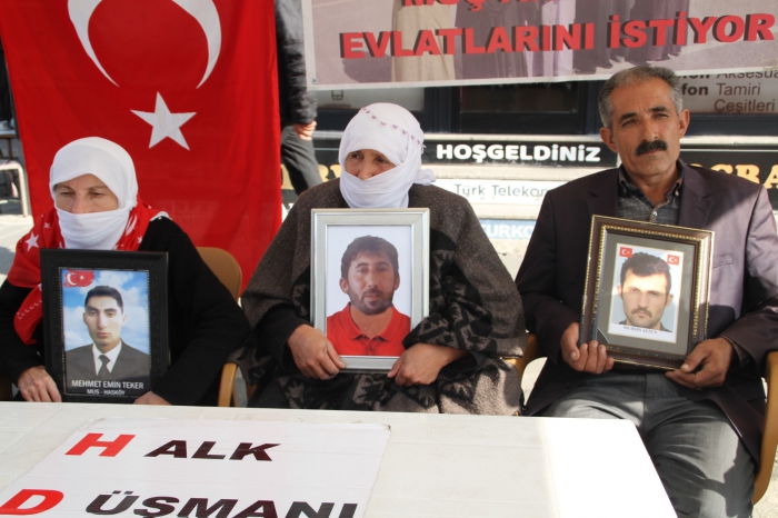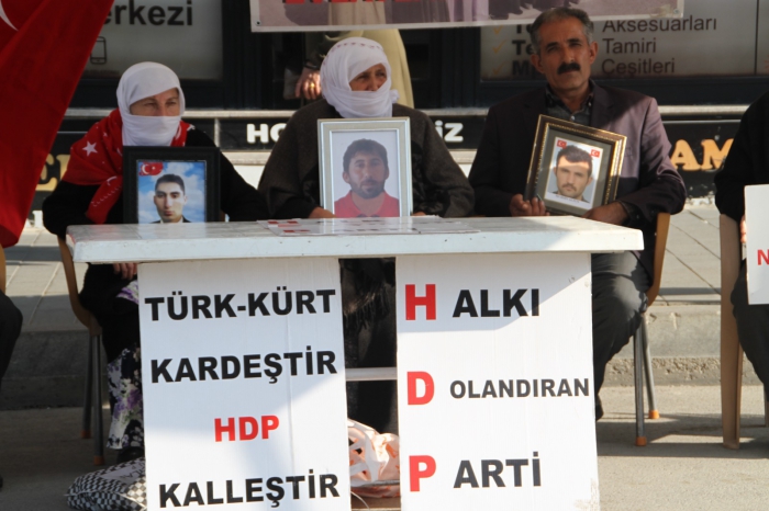 ALPARSLAN DİYARI- Çocuklarına kavuşma ümidiyle Diyarbakır annelerinin başlattığı eyleme destek veren aileler, her hafta çarşamba günü yaptıkları eylemi bu hafta da sürdürdü. HDP İl Başkanlığı binası önünde bir araya gelen aileler, "Halk düşmanı parti", "Evlatlarımızı vereceksiniz", "Ha HDP ha PKK", "Türk-Kürt kardeştir, HDP kalleştir", "Halkı dolandıran parti", "Anneler direniyor", "Artık yeter yakamızdan düşün" ve "Yeter artık evlatlarımızı bırakın" yazılı pankartlar açtı. Çocuklarının fotoğraflarıyla eyleme katılan anne ve babalar, evlatlarına "teslim ol" çağrısında bulundu.
