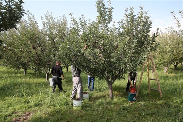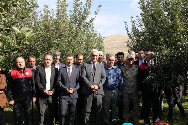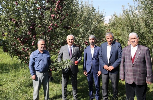 Konuşmaların ardından Vali Çakır ve beraberindeki heyet elma topladı.