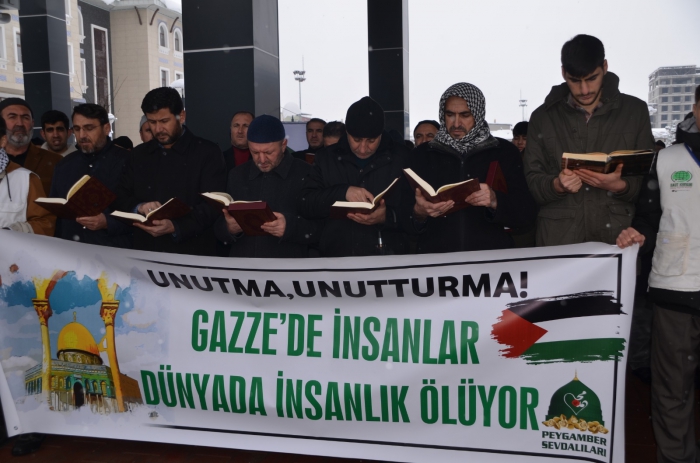 Kent meydanında bir araya gelen Peygamber Sevdalıları adına basın açıklamasını okuyan Bülent Balkaya, “Bu saldırılarla birlikte siyonistler Gazze ile birlikte tüm insanlığa, vicdana savaş açmakta; ümmetin izzet ve şerefine kastetmektedirler. Uluslararası Adalet Divanı’na Güney Afrika Cumhuriyeti tarafından yapılan başvuruyu memnuniyetle karşılıyoruz. Başlayan bu sürece olan desteğimizi bir kez daha beyan ediyoruz. Bu sürecin mümkün olan en kısa sürede tamamlanmasını ve adaletin tecelli etmesini istiyoruz. Okullar, hastaneler, camiler ve evler tamamen ya da kısmen yıkılmış durumdadır. Gazze’nin alt yapısı tamamen çökmüş, açlık, susuzluk ciddi boyutlara ulaşmıştır. Havaların soğumasıyla birlikte barınacak yer bulamayan ve yakacağı olmayan kardeşlerimiz büyük sıkıntılar yaşamaktadır. Refah Sınır Kapısı’nda binlerce yardım tırı bekletilmektedir. Adeta açlık ve kıtlıkla bir millet yok edilmek istenmektedir. Buna asla müsaade edilmemeli ve kapılar derhal açılmalıdır. Gazze’de yaşayan 2,5 milyona yakın mazlum insanın hayatlarının idamesi için gerekli su, gıda, ilaç, barınma ve temel ihtiyaçların karşılanması için insani yardım koridoru acilen açılmalıdır” dedi.