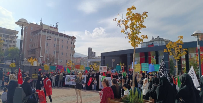 Kent Meydanı’nda toplanan Kadınlar burada bir basın açıklaması yaptı. Basın açıklaması öncesi Beyza Tarhan adlı bir çocuk tarafından şiir okundu. Kadınlar adına açıklama metnini okuyan HÜDA PAR İl Kadın Kolları Başkanı Ayşe Polat, Gazze'de yaşanan soykırım ve katliama dikkat çekti.