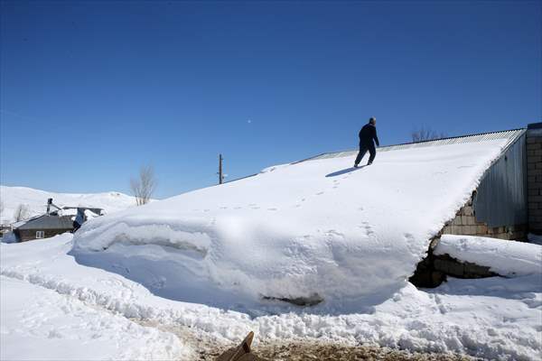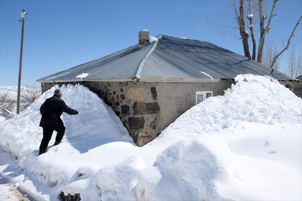 Tek katlı ev ve ahırların karla kaplandığı köyde vatandaşlar, çökme riski nedeniyle ev ve ahırlarının damlarında ve çatılarında biriken karı, küreklerle temizledi.