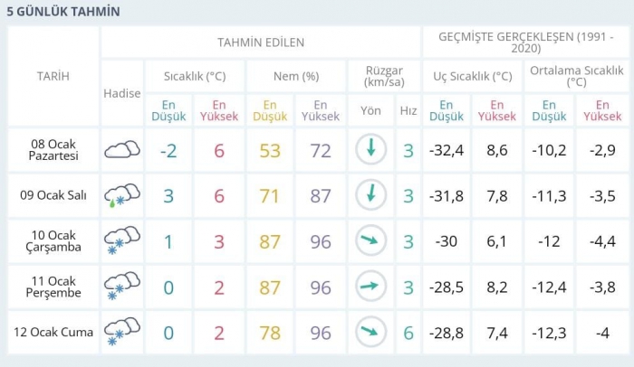 08 Ocak 2024 Pazartesi günü çok bulutlu, sıcaklık 6, 09 Ocak 2024 Salı günü yağmurlu, sıcaklık 4, 10 Ocak 2024 Çarşamba günü hafif yağmurlu, sıcaklık 2, 11 Ocak 2024 Perşembe günü kar yağışlı, sıcaklık 2, 12 Ocak 2024 Cuma günü kar yağışlı, sıcaklık 2.