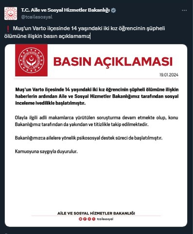 Bakanlıktan yapılan açıklamada, Varto ilçesinde 14 yaşındaki iki kız öğrencinin şüpheli ölümüne ilişkin haberlerin ardından ivedilikle sosyal inceleme başlatıldığı belirtildi.
