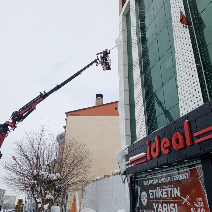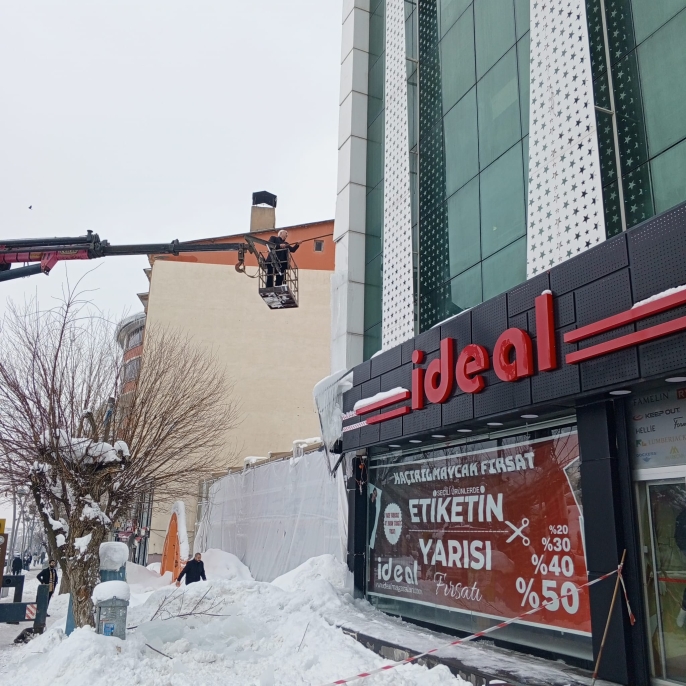 ALPARSLAN DİYARI-Mağaza yönetimi, çatıda biriken yoğun kar ve tehlike oluşturan buz sarkıtlarını vinç yardımıyla kontrollü biçimde temizleterek hem vatandaşların can güvenliğini sağladı hem de esnaf duyarlılığına güçlü bir mesaj verdi.