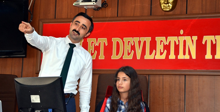 ALPARSLAN DİYARI- Başsavcı Kantar, doğuştan elleri olmayan Cumhuriyet Ortaokulu 7. sınıf öğrencisi Şanci'nin savcı olmak istediğini duydu. Bunun üzerine Şanci'yi Muş Adalet Sarayı'nda ağırlayan Kantar, kadın hakim ve savcılarla tanıştırdığı öğrenciye cübbesini giydirdi, mesleği hakkında bilgiler verdi. Daha sonra duruşma salonuna götürülen Şanci, Adalet Komisyonu ve 1. Ağır Ceza Mahkemesi Başkanı İbrahim Karlı ve mahkeme heyetiyle tanıştı.