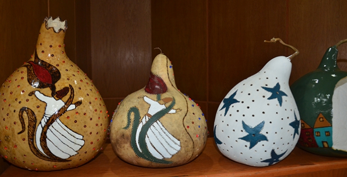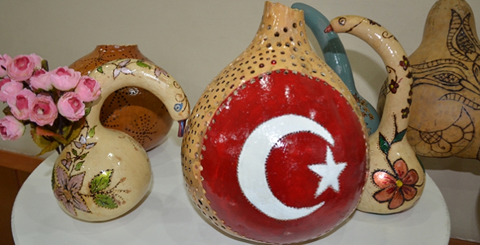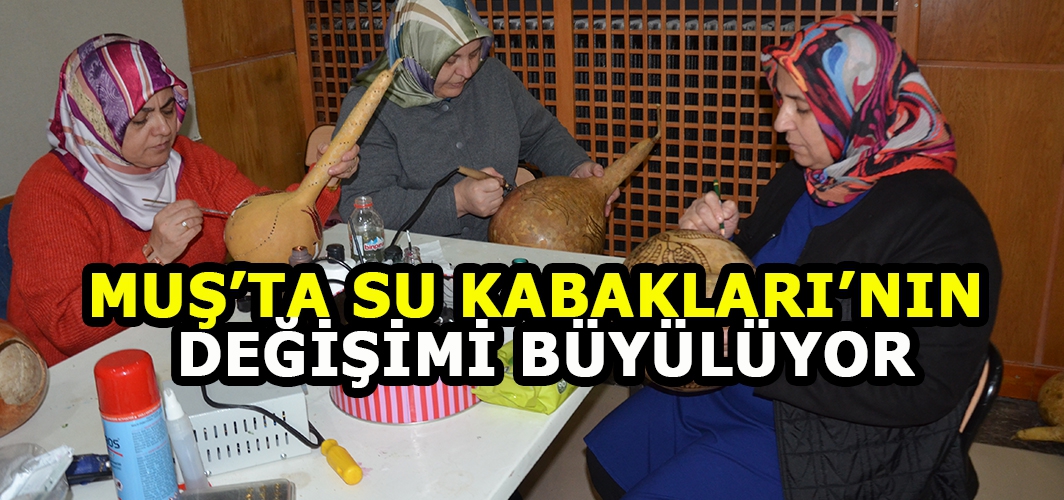 ALPARSLAN DİYARI- Kültür ve Turizm Müdürlüğü ile Halk Eğitimi Merkezi Müdürlüğü bünyesinde açılan su kabağı işlemeciliği kursuna katılan kursiyerler, su kabaklarından gece lambası, avize, sepetlik ve saksı gibi çeşitli dekoratif objeler yapıyor.