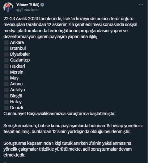 Adalet Bakanı Yılmaz Tunç, sosyal medyada, 22-23 Aralık 2023 tarihlerinde, Irak’ın kuzeyinde bölücü terör örgütü mensupları tarafından 12 askerin şehit edilmesi sonrasında sosyal medya platformlarında terör örgütünün propagandasını yapan ve dezenformasyon içeren paylaşım yapan kişilerin tutuklandığını belirtti.