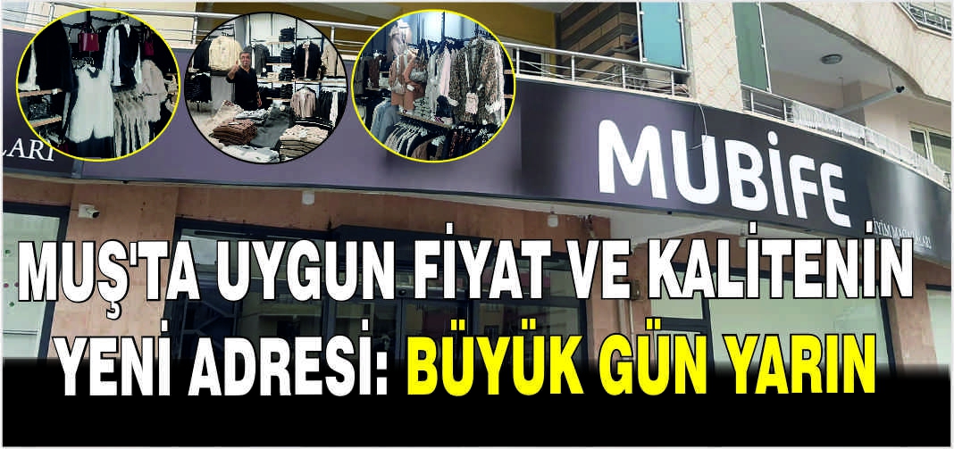 Adil Yazar bitişiğinde, Lale 3 Sitesi cadde güzergahında yer alan Mubife Giyim Mağazası, 750 metrekarelik geniş bir alanda hizmet verecek. Erkek ve kadın giyiminde yüzlerce çeşit markayı bir araya getiren mağaza, “Ucuzdan da Ucuz” sloganıyla Muş halkının ilgisini çekmeyi hedefliyor.