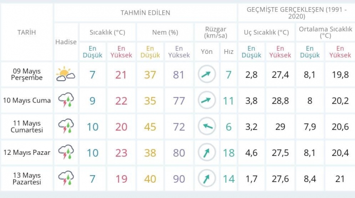 Meteoroloji, Muş, Bitlis, Hakkari illeri ile Van'ın güney ve doğu ilçelerinde öğle ve akşam saatleri arasında yağışların yerel olarak kuvvetli (21-50 kg/m2) sağanak ve gök gürültülü sağanak yağışlı olması bekleniyor. Yağışların; Van, Bingöl, Muş, Bitlis, Şırnak ve Hakkari çevrelerinde yer yer kuvvetli olması bekleniyor. 2000 metre üzeri rakımlı yerlerde yağışların karla karışık yağmur ve kar şeklinde görüleceği tahmin ediliyor.