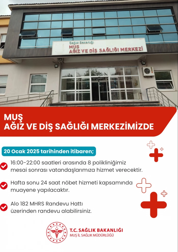ALPARSLAN DİYARI- Muş Ağız ve Diş Sağlığı Merkezi'nde vatandaşların hizmetine sunulan yeni düzenlemeyle birlikte, 20 Ocak 2025 tarihinden itibaren hafta içi 16.00-22.00 saatleri arasında 8 poliklinikte mesai sonrası hizmet verilecek. Ayrıca hafta sonları 24 saat nöbet hizmeti de sunulacak. Randevu almak için Alo 182 MHRS hattı kullanılabilir.