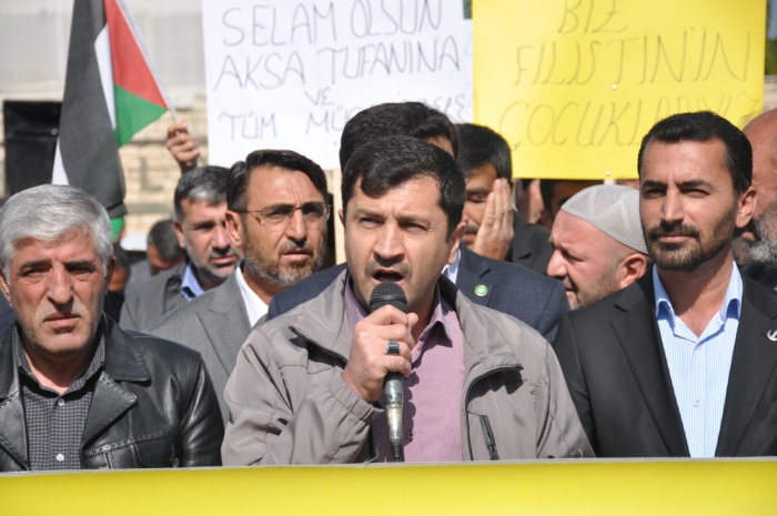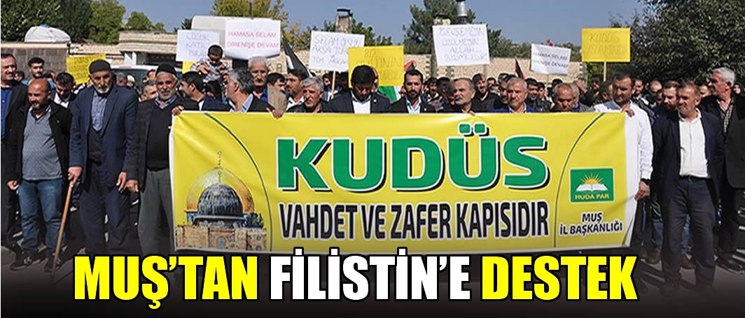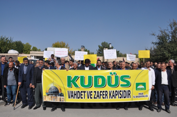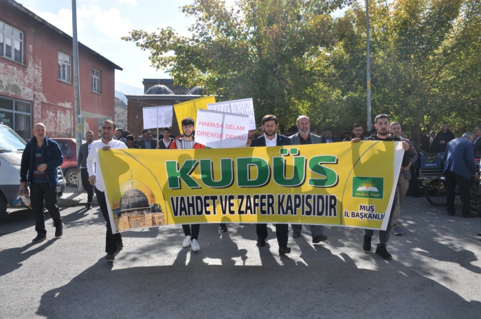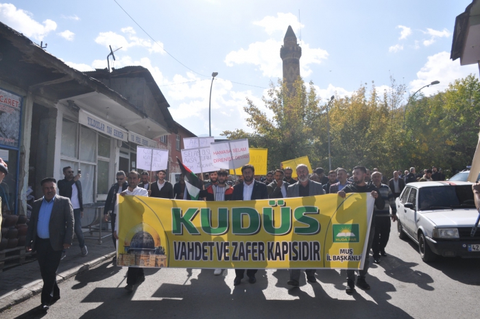Hacı Şeref Camii önünde toplanan kalabalık Belediye Meydanı’na kadar yürüdü. Burada toplanan vatandaşlar, ellerinde 'Katil İsrail, Filistin'den defol', ‘Hamasa Selam Direnişe Devam’, ‘Muş’tan Hamasa Selam Direnişe Devam’ ‘Kudüs Vahdet ve Zafer Kapısıdır’ yazılı pankart taşıyıp, ABD ve İsrail aleyhine slogan attı. Kalabalık adına açıklamayı yapan HÜDA-PAR Muş İl Başkanı Mehmet Şirin Çağlayan, Gazze’de yıkım, ölüm, vahşet ve katliam olduğunu söyledi. Gazze’nin üstüne bombaların yağdığını ifade eden Başkan Mehmet Şirin Çağlayan, “Gazze’de elektrik yok, su yok, yiyecek yok, yaşama hakkı yok. Gazze’de sadece vahşi bir soykırım var. Masum çocuklar ölüyor, kadınlar ölüyor, ihtiyarlar ölüyor ve bunların toplamı olan siviller ölüyor. Hastanelerde yer yok, yoğun bakımlar işlevsiz, jeneratörlerin yakıtı bitti. Bugün Gazze’de insanlık tarihinde görülmemiş bir vahşet yaşanmaktadır. Emperyalist güçlerin desteğini arkasına alan Siyonist işgal rejimi, bütün dünyanın gözü önünde Gazze’de soykırım uyguluyor. Ama İslam alemi sessiz, dünya sessiz, sözde insan hakları savunucuları başını kuma gömmüş durumdadır” diyerek ABD ve İsrail aleyhine slogan attı.