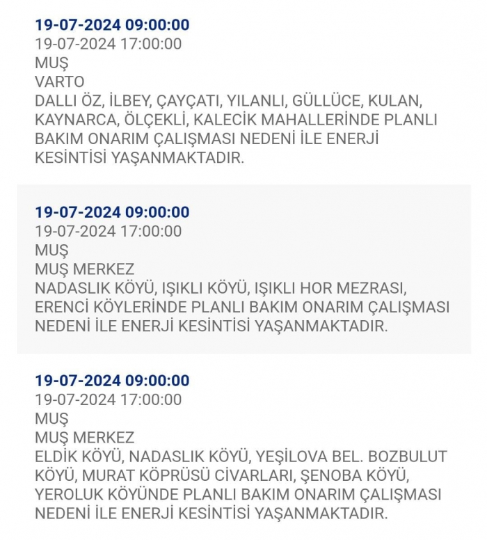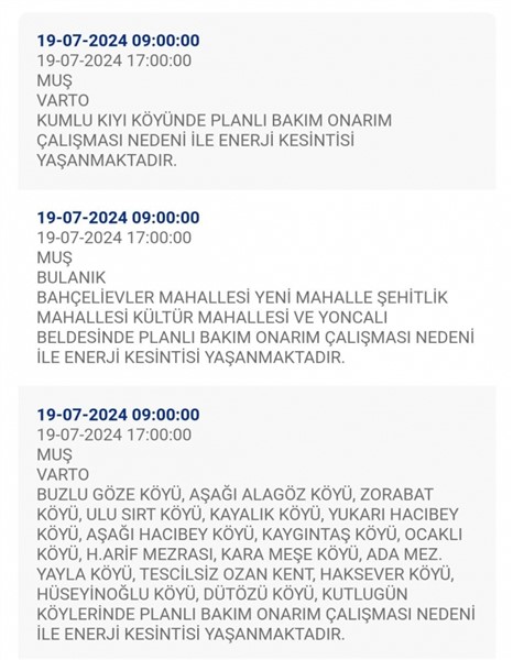 ALPARSLAN DİYARI- VEDAŞ yaptığı son duyuruda Muş merkez ve 2 ilçesinde bakım ve onarım çalışmalarından dolayı elektrik kesintisinin yaşanacağını duyurdu. Muş Merkez, Varto ve Bulanık ilçelerinde elektrik kesintisinden dolayı yapılan duyuruda saatler ve detaylar aktarıldı.