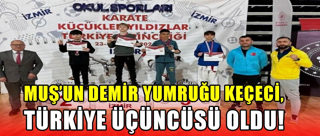 ALPARSLAN DİYARI- Muş’ta genç sporcular başarılı grafiklerini sürdürüyor. 23-24 Mart 2024 Tarihleri arasında İzmir’de düzenlenen Okul Sporları Yıldızlar Türkiye finallerinde, Fatih Ortaokulu öğrencisi Mustafa Taha Keçeci, Yıldızlar Karate kategorisinde Türkiye üçüncüsü oldu.
