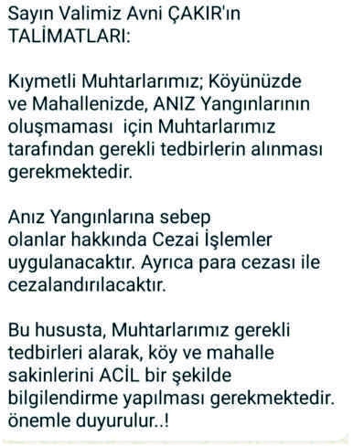 "Kıymetli Muhtarlarımız; köyünüzde ve mahallenizde, anız yangınlarının oluşmaması için muhtarlarımız tarafından gerekli tedbirlerin alınması gerekmektedir.